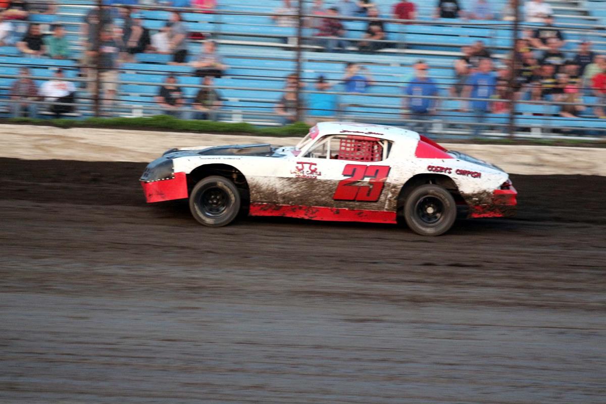 A thrilling finish in the S&J Plumbing Pure Stock A-Main at the Twister Showdown was all for not after the top two drivers were found illegal in post-race tech inspection. Jordon Shive took the lead on lap two from Paul Dilbeck and led until the final half a lap when a three-wide finish resulted in what looked to be JD Jackson’s first win of the season until he was disqualified for running an aluminum intake on a claim engine. Nathan Campbell also passed Shive on the final lap only to be denied in the tech barn for utilizing illegal tires. These developments gave Shive, who dominated the majority of the race, his first career win worth $400. Steve Freeman rallied from eighth to second to take over the points lead in the division. Tray Roberts started seventh and finished third, pole-sitter Paul Dilbeck maintained fourth, and Billy Arnold rounded out the top five.
