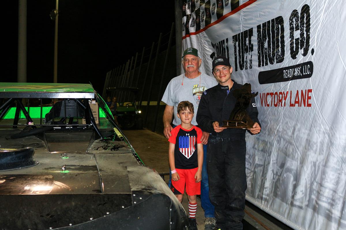 The S&J Plumbing Pure Stock A-Main was the first Feature of the evening and two drivers quickly established themselves as the class of the field. JD Jackson and Nathan Campbell took advantage of their first and second row starting spots to make the 15-lap A-Main a two-car show. Jackson led the entire Feature, surviving a two-lap shootout to win his first of the season over Campbell. The Shive brother duo, Josh and Jordon, led hard charges from mid-pack to finish third and fourth, respectively, while Roger Starling rounded out the top five.