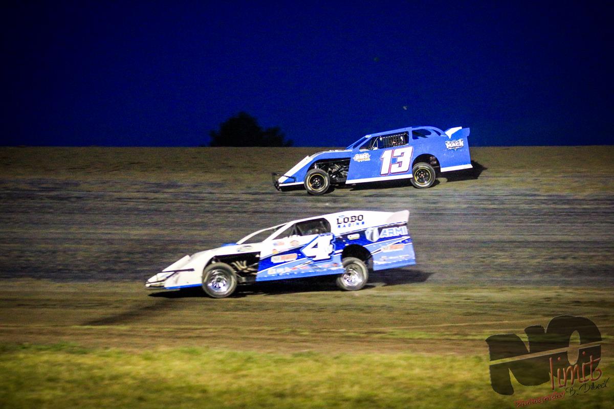 Just as the title implies the Modified A-Main was jammed full of slide jobs. The vast amount of sliders began around the halfway point when Tyler Wolff and Justin Rexwinkle swapped positions a few times in the race for second. After a few laps Wolff disposed of Rexwinkle and set his sights on the race leader, Jonathon Beyer. Beyer maintained the lead officially in the exchange until lap 16 when Wolff cleared Beyer for the final time en route to his third win of the season; Beyer finished with the runner-up honors. Another slide job contest settled the race for third as well as Mitch Keeter bested Rexwinkle in that duel. Jared Russell, fresh off a win at Thunderbird Speedway, finished fifth.