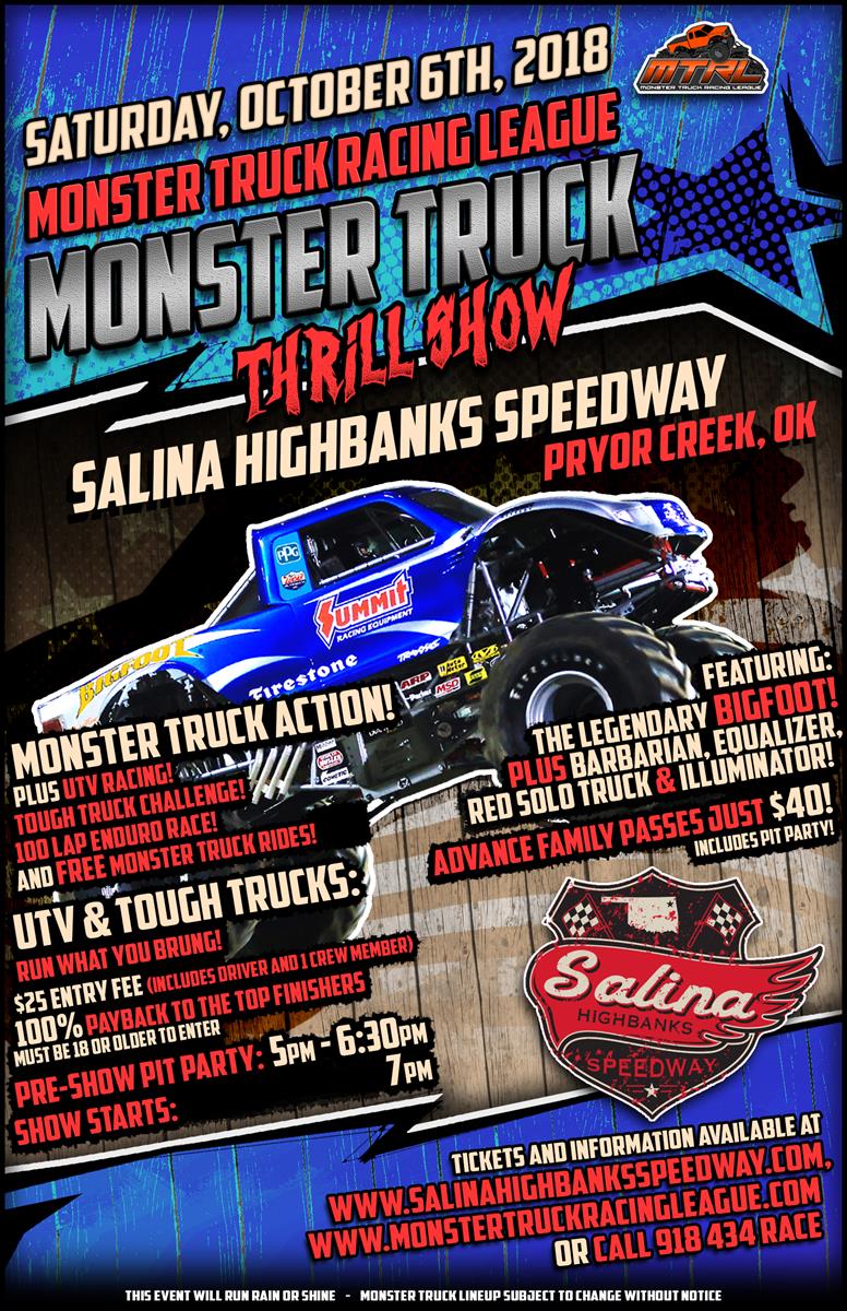 The highly anticipated inaugural event, Monsters On The Highbanks is now upon us. For the first time ever Monster Trucks invade the Salina Highbanks Speedway for a huge, action-filled event. The legendary Bigfoot will headline the program, sanctioned by the Monster Truck Racing League, along with Equalizer, Barbarian, Red Solo Truck and one additional monster truck TBA. What’s more, the event will also include the Tough Truck Challenge, UTV races, and a 100-lap Enduro. Fans will be able to participate in the pre-show Meet & Greet as part of their general admission ticket. Another added bonus to the show, fans can go for a spin in the Monster Truck Ride Truck also completely free of charge courtesy of Arkansas Myriad!